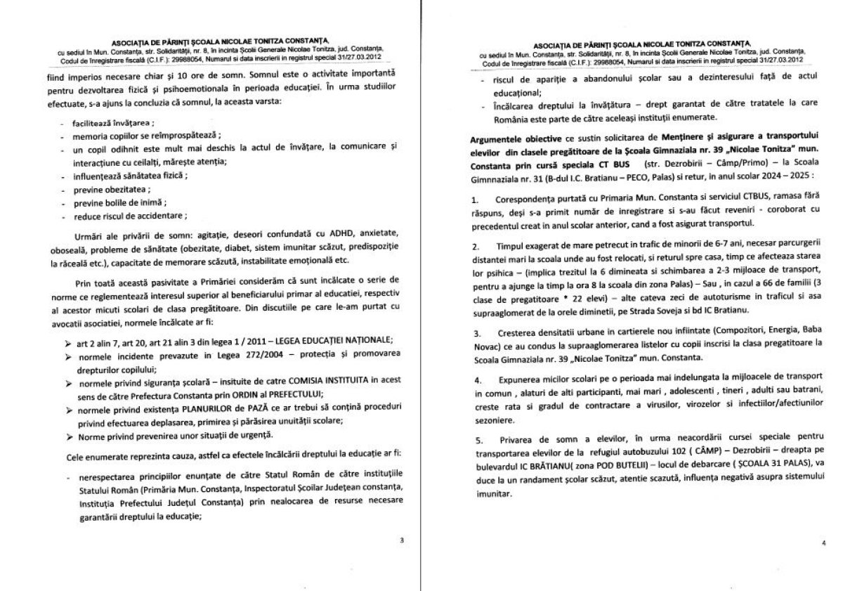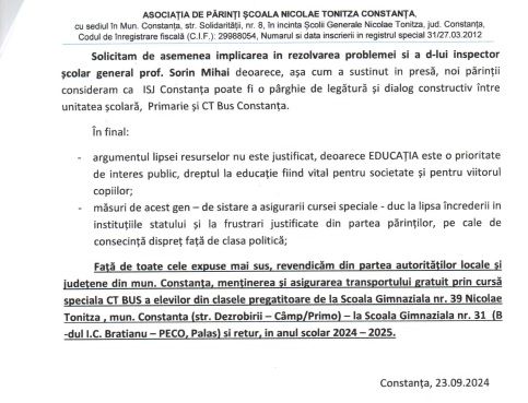 În finalul memoriului, Asociația de Părinți solicită intervenția de urgență a Primăriei Municipiului Constanța, a Consiliului Local și a Inspectoratului Școlar Județean pentru a garanta continuarea transportului gratuit pentru elevii claselor pregătitoare pe traseul Școala Gimnazială nr. 39 „Nicolae Tonitza” – Școala Gimnazială nr. 31 și retur. „Argumentul lipsei resurselor nu este justificat, deoarece educația este o prioritate de interes public, dreptul la educație fiind vital pentru societate și pentru viitorul copiilor”, se concluzionează în memoriu.
