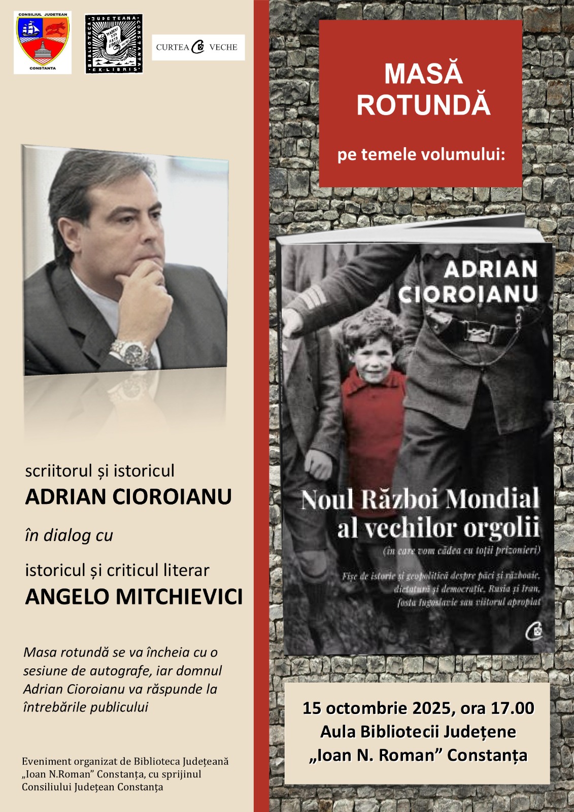 Constănțenii pasionați de istorie, literatură și reflecție critică sunt invitați miercuri, 15 octombrie 2025, de la ora 17.00, la Biblioteca Județeană „Ioan N. Roman” din Constanța, pentru a lua parte la un dialog de excepție între istoricul Adrian Cioroianu și scriitorul și criticul literar Angelo Mitchievici.