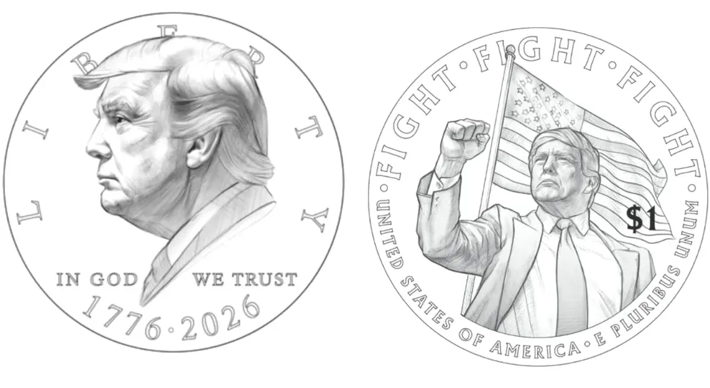 Moneda, care ar marca 250 de ani de la Declarația de Independență a SUA, are pe avers imaginea lui Trump în profil, iar pe revers acesta ridică pumnul în semn de sfidare, însoțit de cuvintele „luptă, luptă, luptă”, un slogan simbolic care a apărut după tentativa de asasinare a președintelui în 2024.