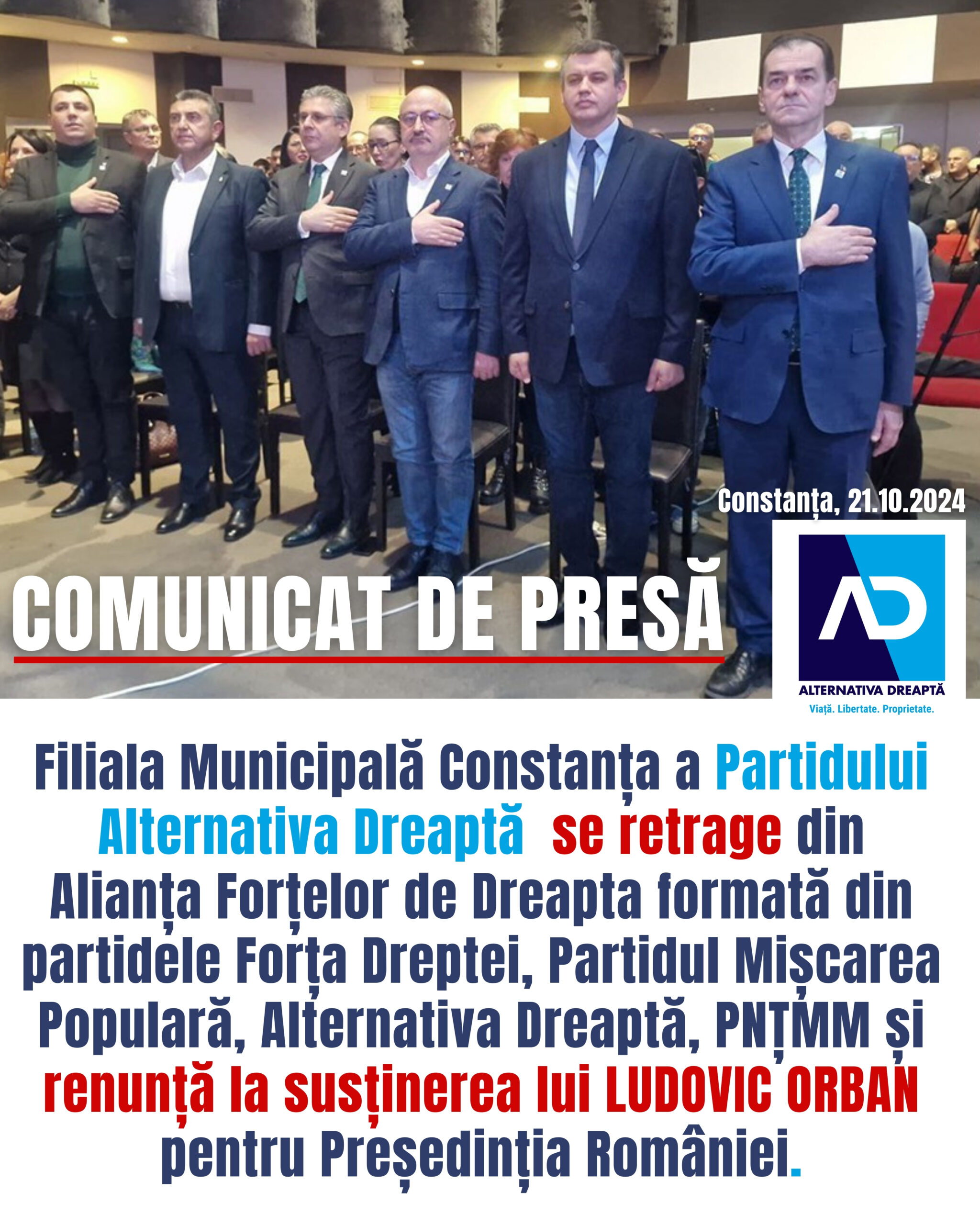 Filiala Municipală a Partidului Alternativa Dreaptă Constanța 𝘀𝗲 𝗿𝗲𝘁𝗿𝗮𝗴𝗲 din Alianța Forțelor de Dreapta formată din partidele Forța Dreptei, Partidul Mișcarea Populară, Alternativa Dreaptă, PNȚMM și...