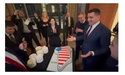 Liderul AUR, George Simion, a fost surprins într-un videoclip în Statele Unite în timp ce taie un tort în formă...